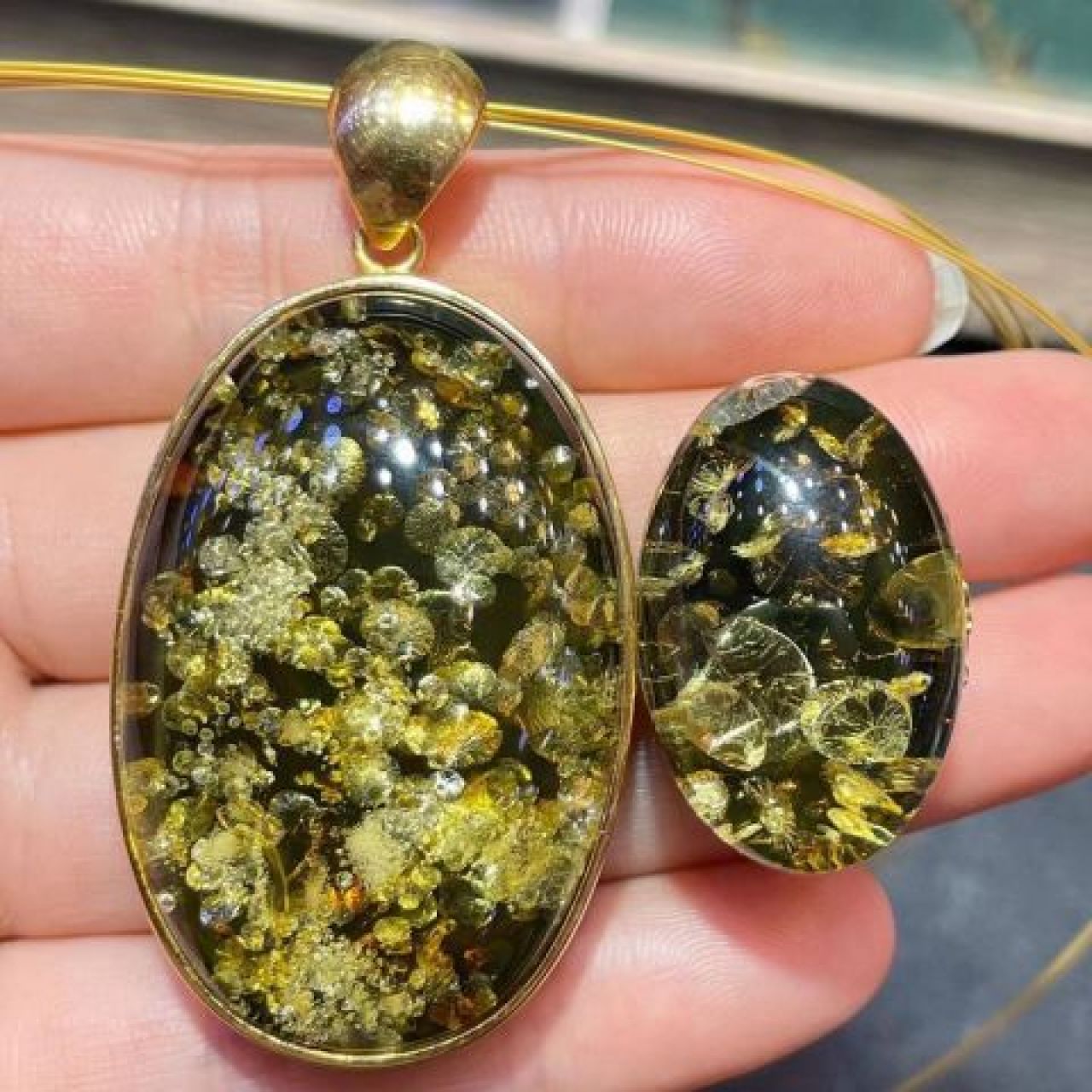 天然琥珀波兰花朵意境优美花珀水滴吊坠戒指套装