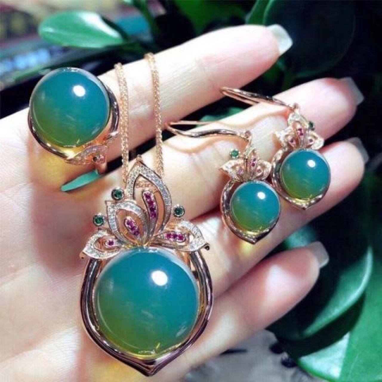 天然墨西哥净水蓝珀24k吊坠耳环戒指四件套装