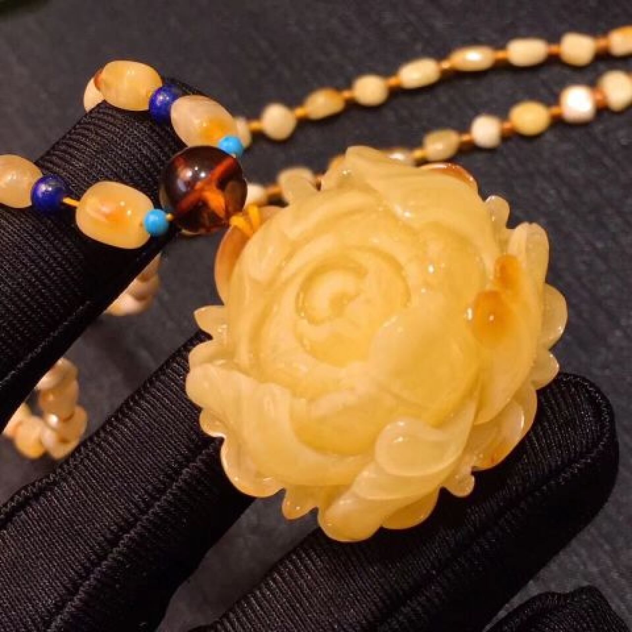 天然原矿蜜蜡牡丹花满蜜鸡油黄雕刻吊坠不含项鍊(33x31x20毫米)