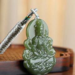 男款双面精雕青白玉坐莲观音玉佩项链玉石吊坠